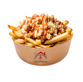 Tenders, oignons cuits, frites, mozzarella, sauce fromagère, cheddar
